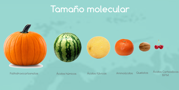 Dentro destes ácidos orgânicos existem grandes diferencias tanto em seu tamanho como em sua capacidade para formar complexos assimiláveis pelas plantas. Em função de suas caraterísticas químicas e de seu tamanho molecular podemos representa-los da seguinte forma: