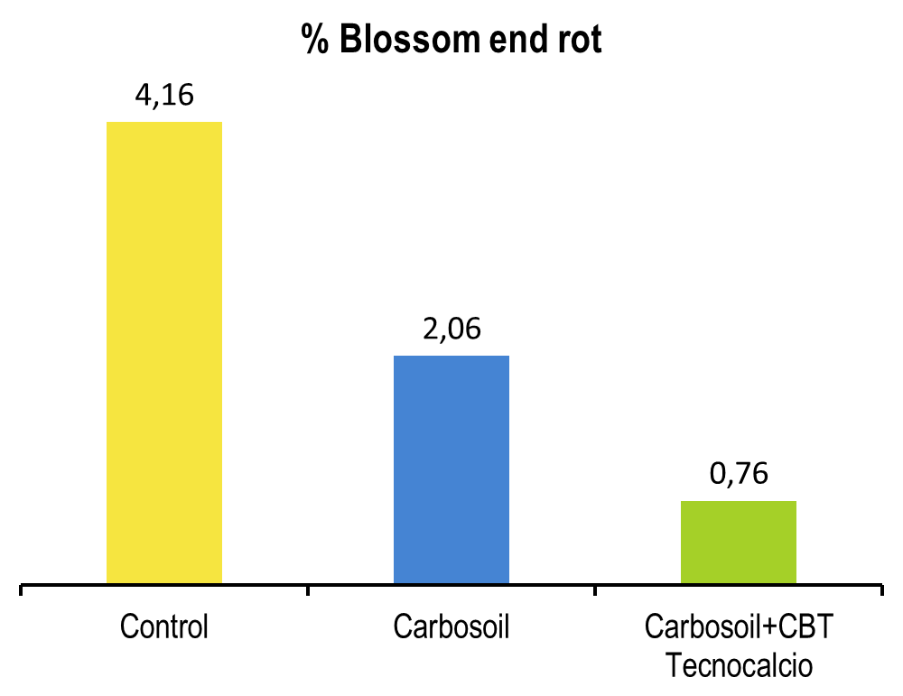 La fisiopatía blossom end rot (mancha apical) disminuyó un 2,1% con Carbosoil (radicular) y desapareció casi por completo (- 3,4%) combinado con CBT Tecnocalcio (foliar). El rendimiento incrementó un 26% con estos tratamientos.