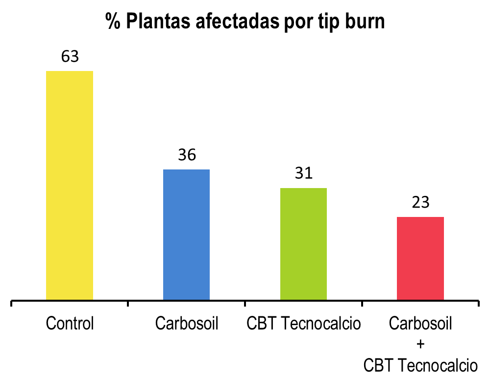 The CARBOTECNIA products reduced the percentage of plants affected by tip-burn by 50%, and the number of leaves with symptoms (burned tips) by 60%. The yield increased by 10%.